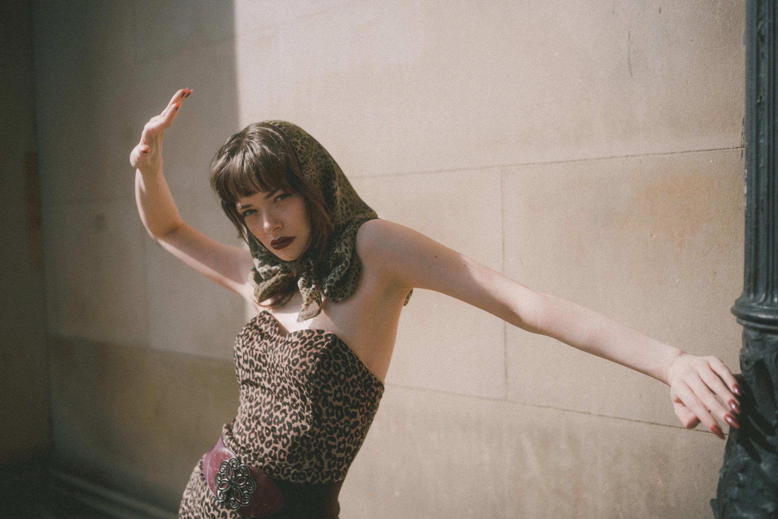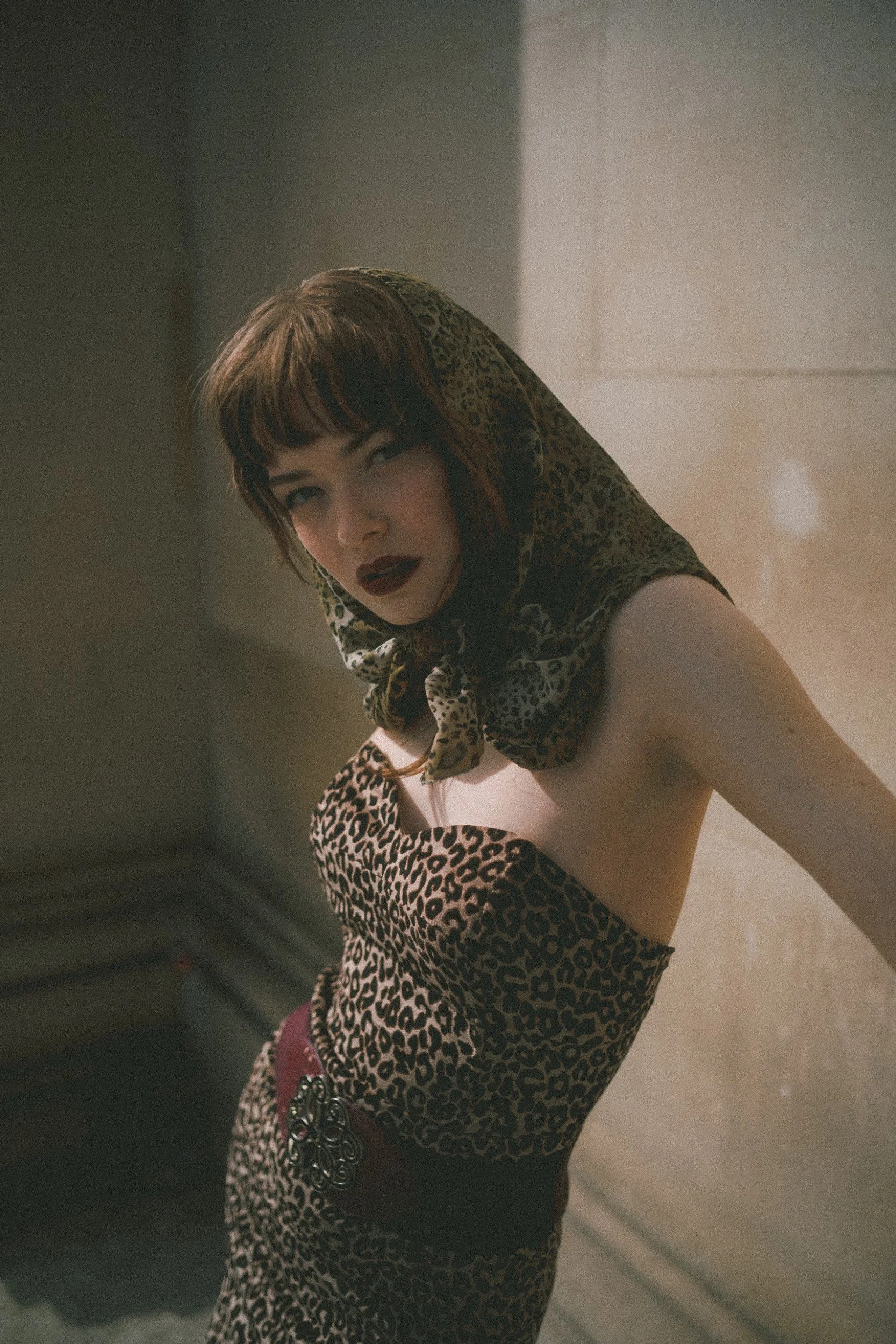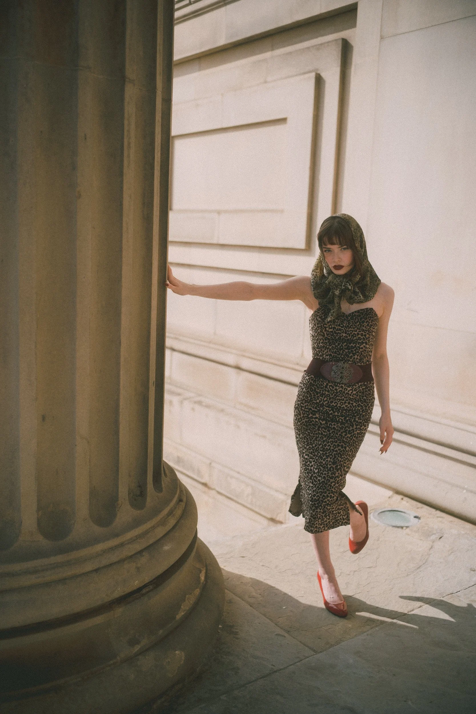 In the editorial Daisy wears a body-hugging leopard print dress that screams confidence. The look is cinched at the waist with a wide, embellished belt that adds structure and a little extra drama. Paired with deep red heels and a bold, dark lip, she channels that classic 1950s bombshell energy—but in a way that also feels current.
