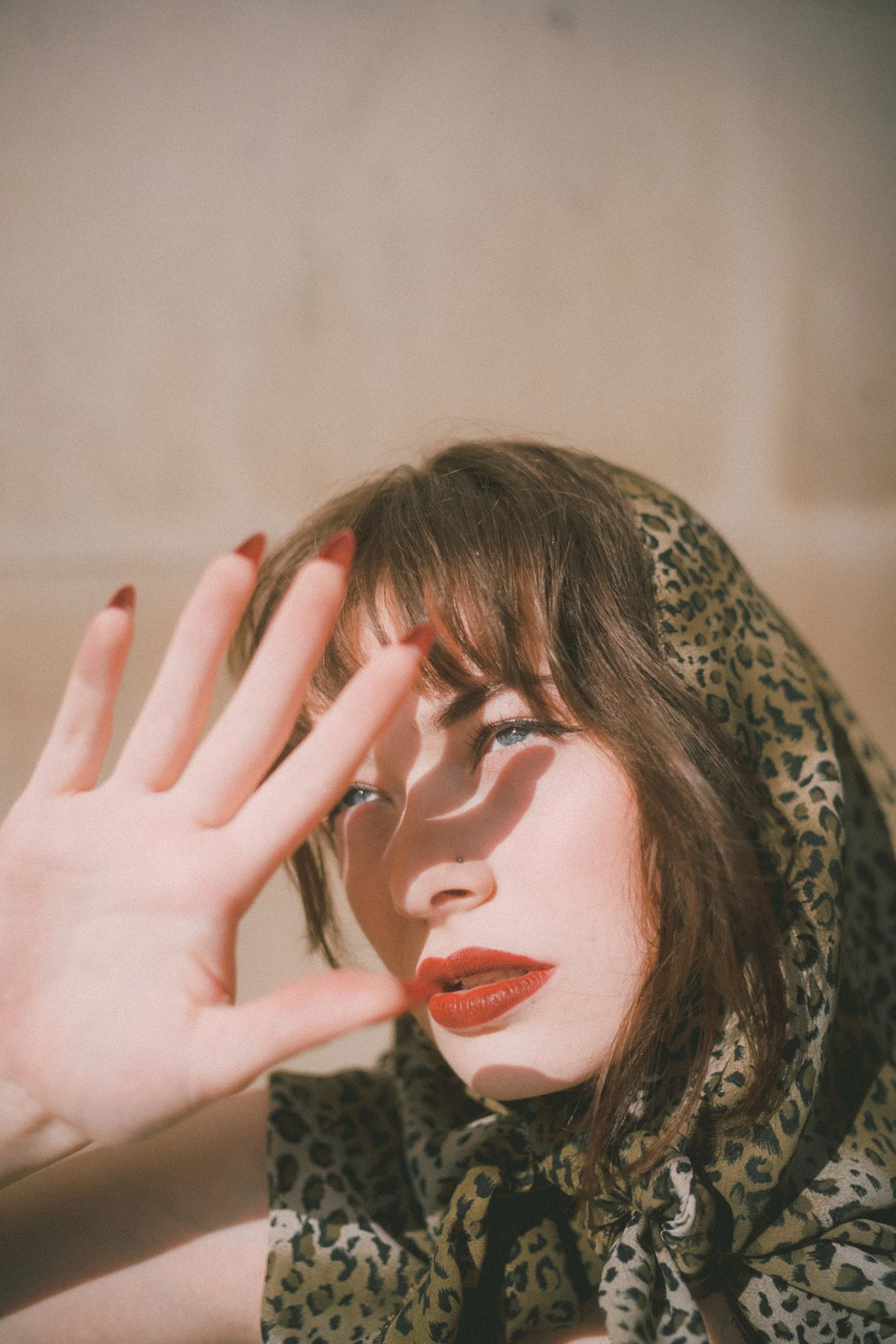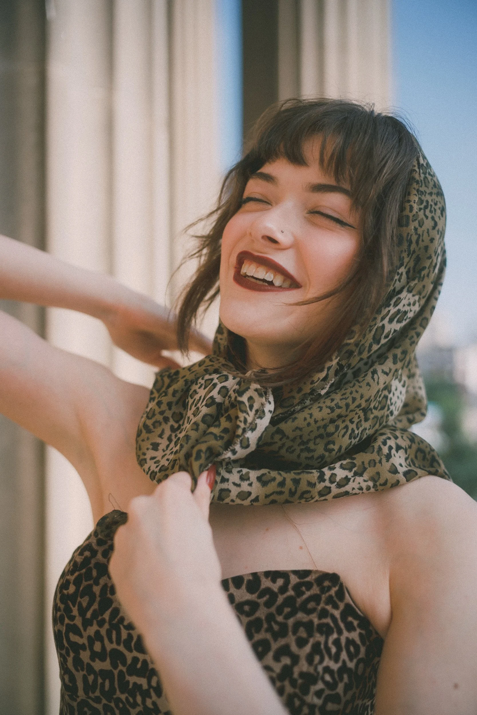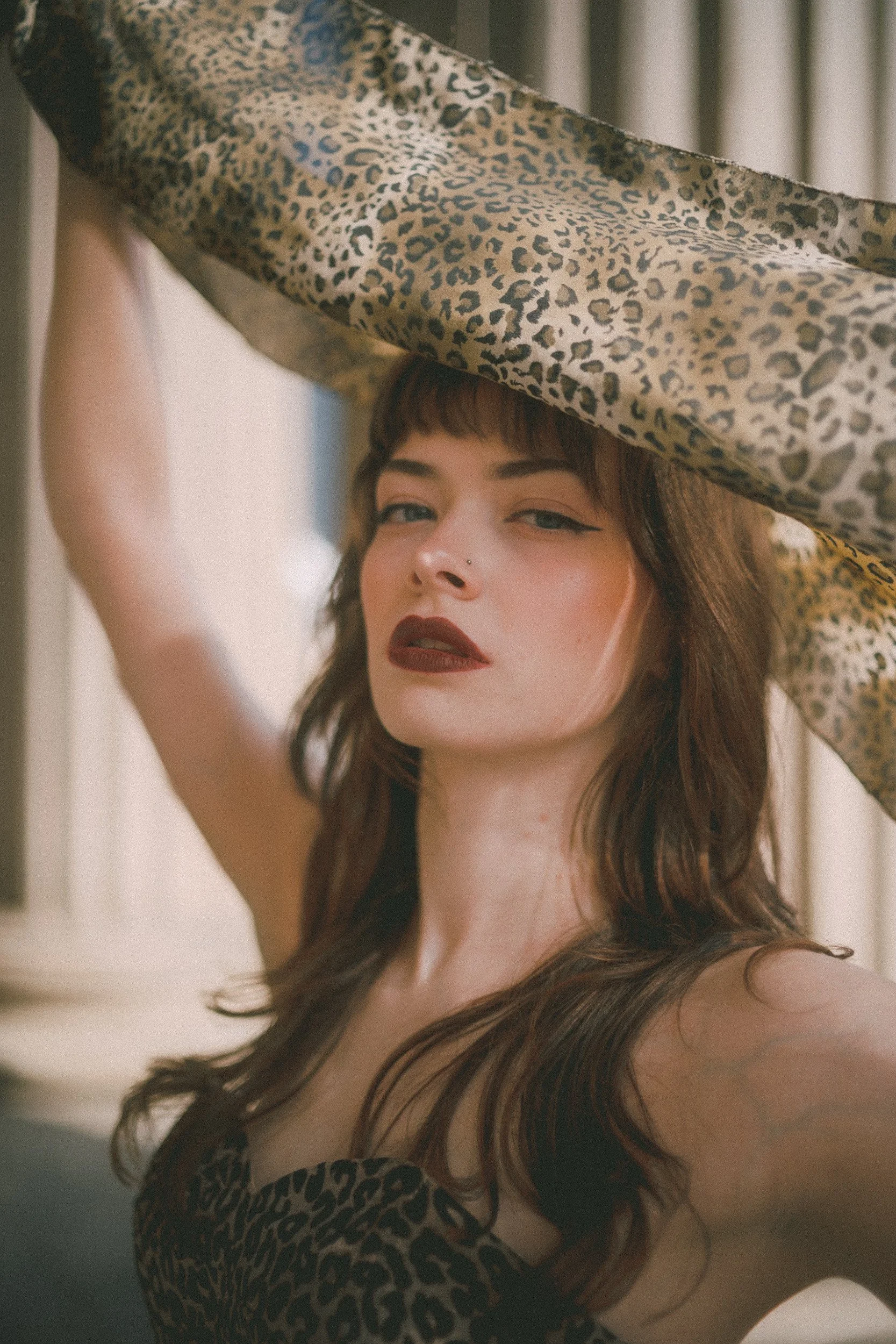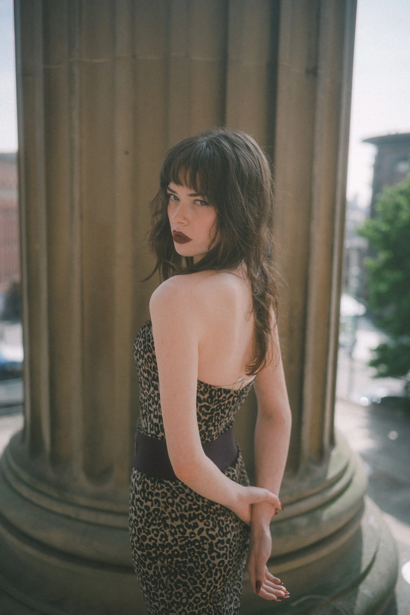 In the editorial Daisy wears a body-hugging leopard print dress that screams confidence. The look is cinched at the waist with a wide, embellished belt that adds structure and a little extra drama. Paired with deep red heels and a bold, dark lip, she channels that classic 1950s bombshell energy—but in a way that also feels current.