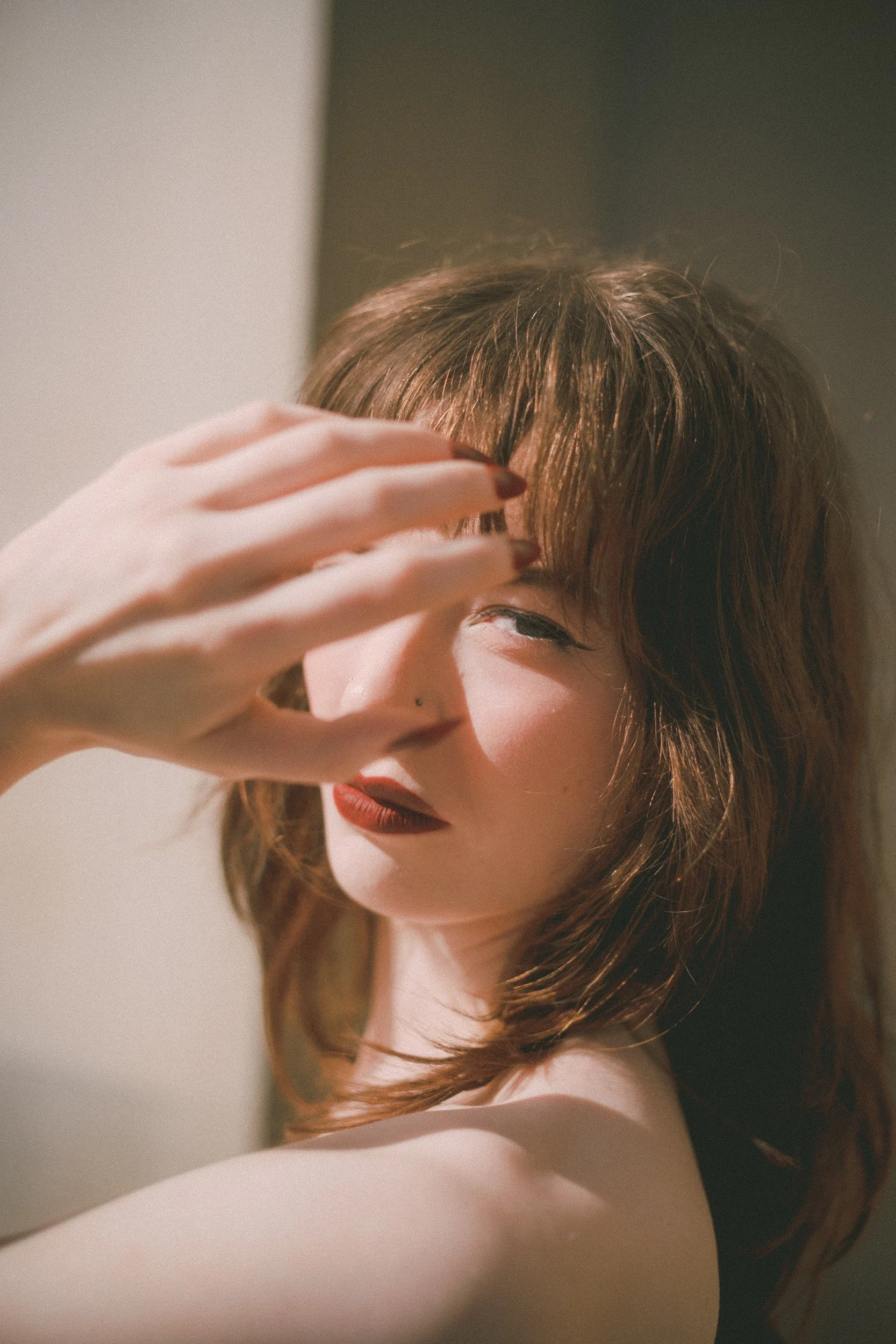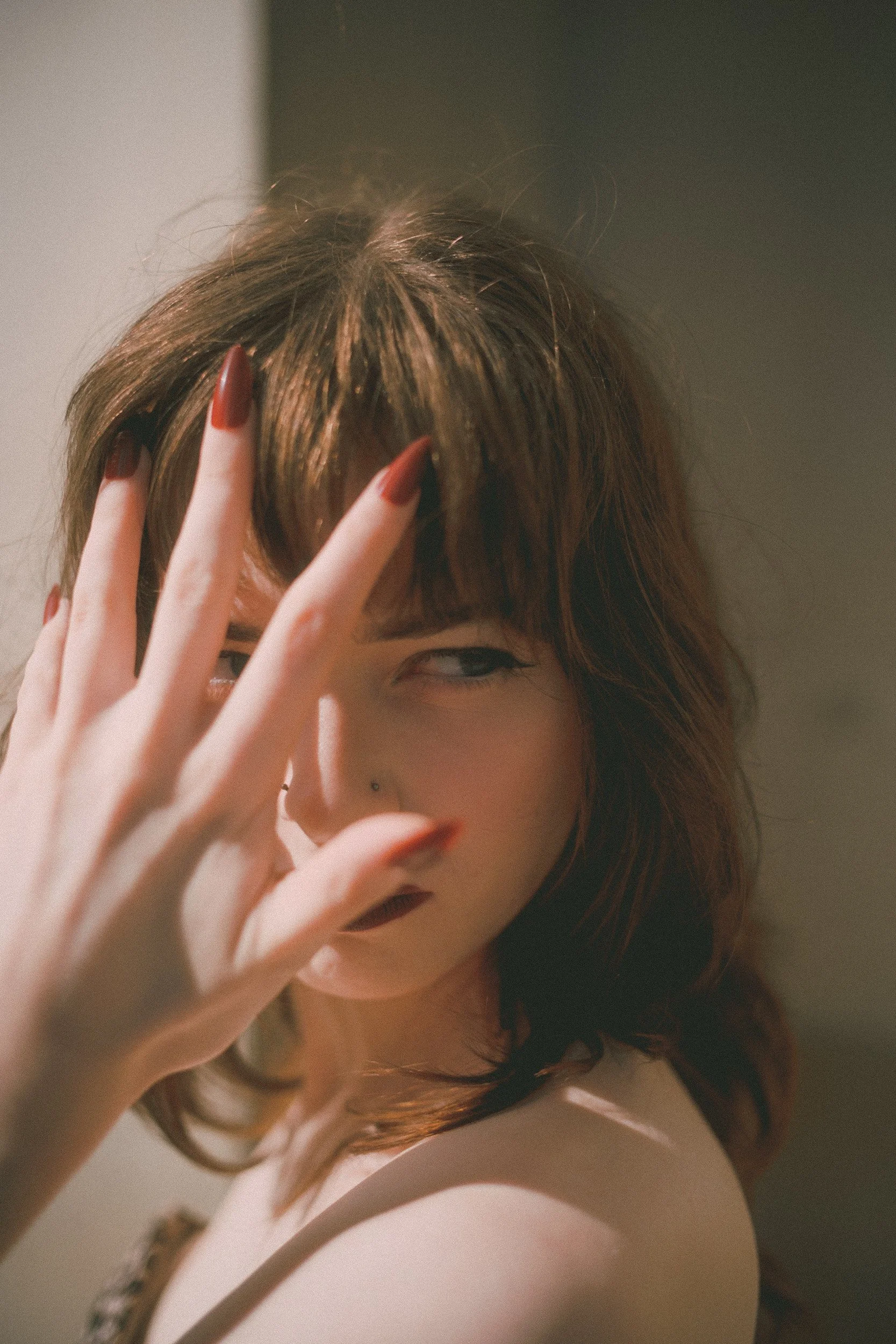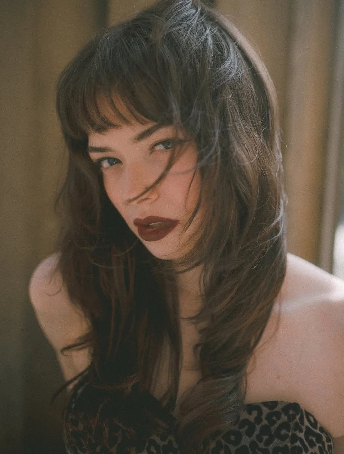 Her hair, softly curled with a full fringe, gives a nod to vintage icons, while her confident pose and strong gaze bring a cool, contemporary attitude. It’s that perfect mix of timeless and daring—a look that turns heads without trying too hard.